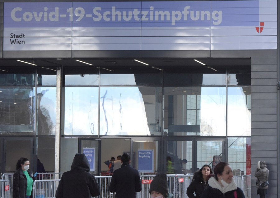 People are seen in front of Austria center, a vaccination center in Vienna, Austria, on Feb. 5, 2022. (Xinhua/Guo Chen)