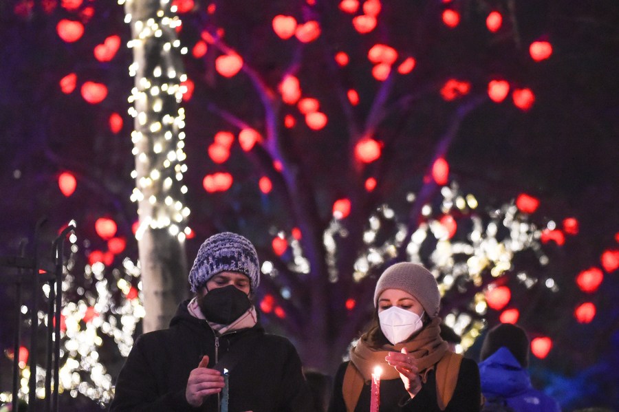 People hold candles to mourn the victims of COVID-19 during an event in Vienna, Austria, Dec. 19, 2021. (Xinhua/Guo Chen)