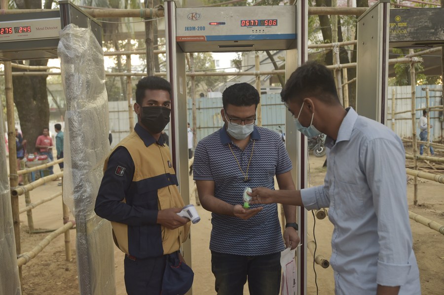 A visitor gets his hands sanitized at the entrance to a book fair in Dhaka, capital of Bangladesh, on Feb. 15, 2022. (Xinhua)