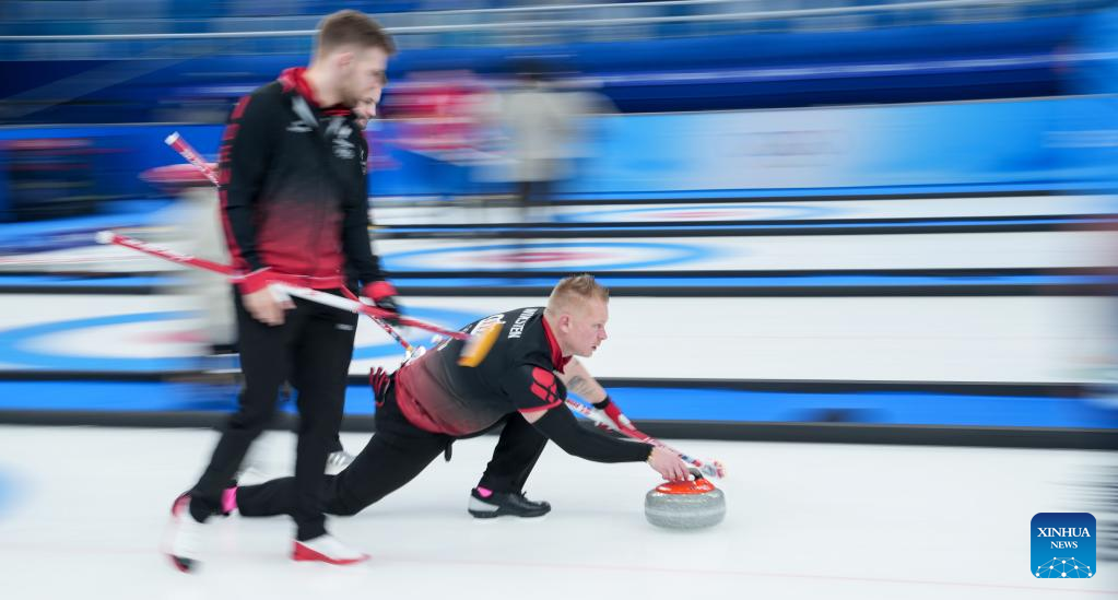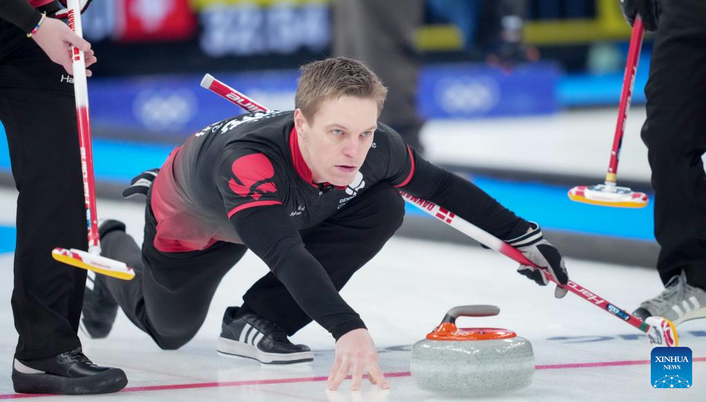Kasper Wiksten (top) of Denmark competes during the curling men's round robin session 12 of Beijing 2022 Winter Olympics between the United States and Denmark at National Aquatics Centre in Beijing, capital of China, Feb. 17, 2022. (Xinhua/Zhou Mi)