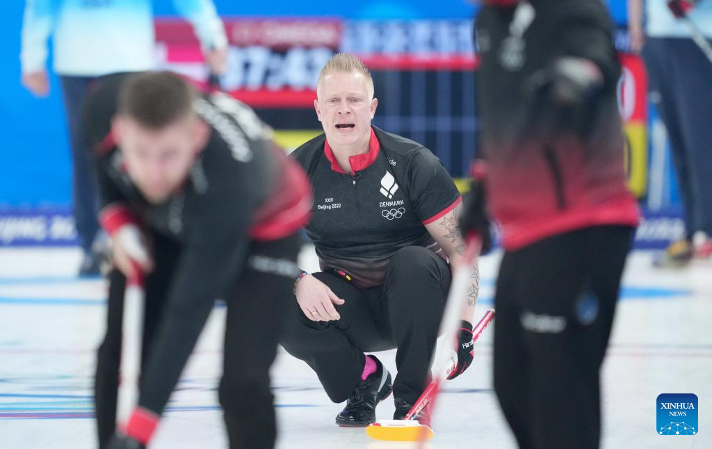 Kasper Wiksten (C) of Denmark competes during the curling men's round robin session 12 of Beijing 2022 Winter Olympics between the United States and Denmark at National Aquatics Centre in Beijing, capital of China, Feb. 17, 2022. (Xinhua/Zhou Mi)