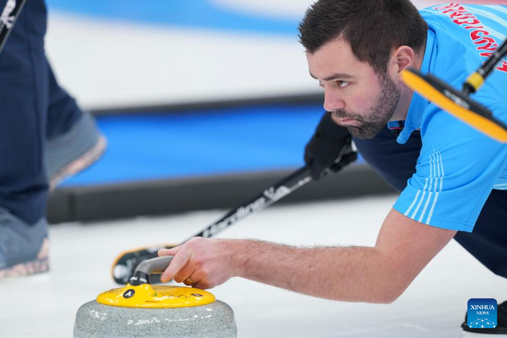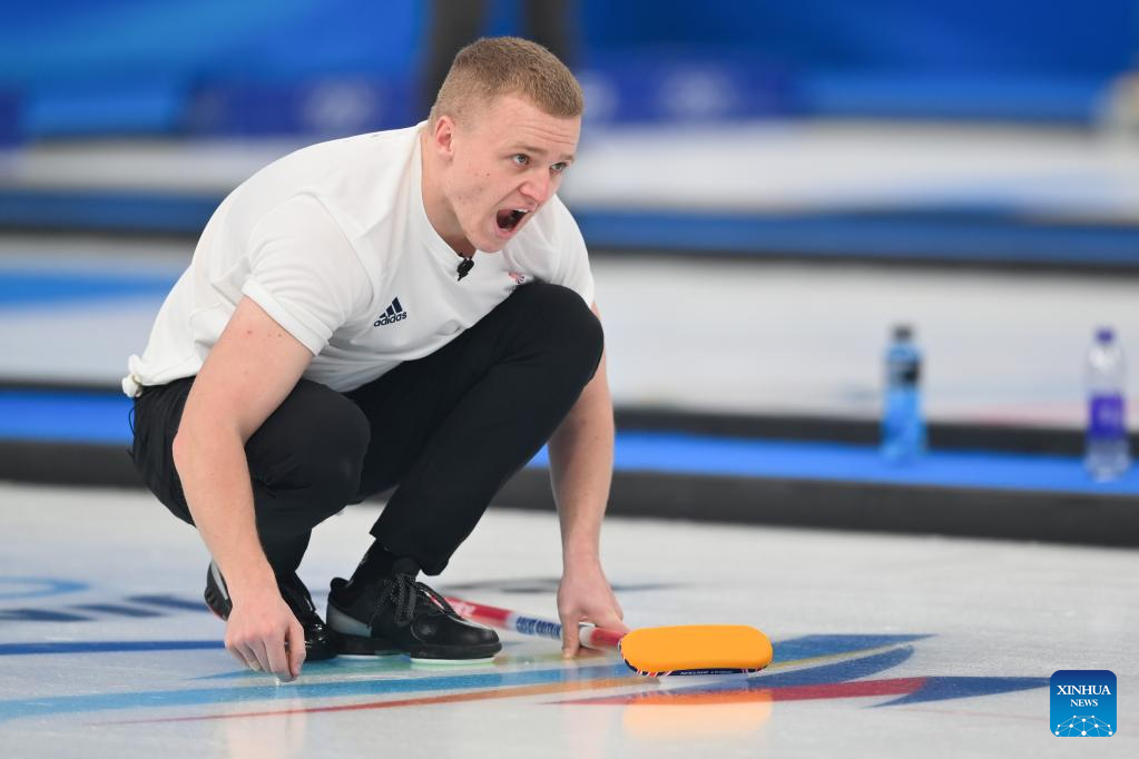 Bobby Lammie of Great Britain competes during the curling men's round robin session 12 of Beijing 2022 Winter Olympics between Great Britain and Canada at National Aquatics Centre in Beijing, capital of China, Feb. 17, 2022. (Xinhua/Xue Yuge)