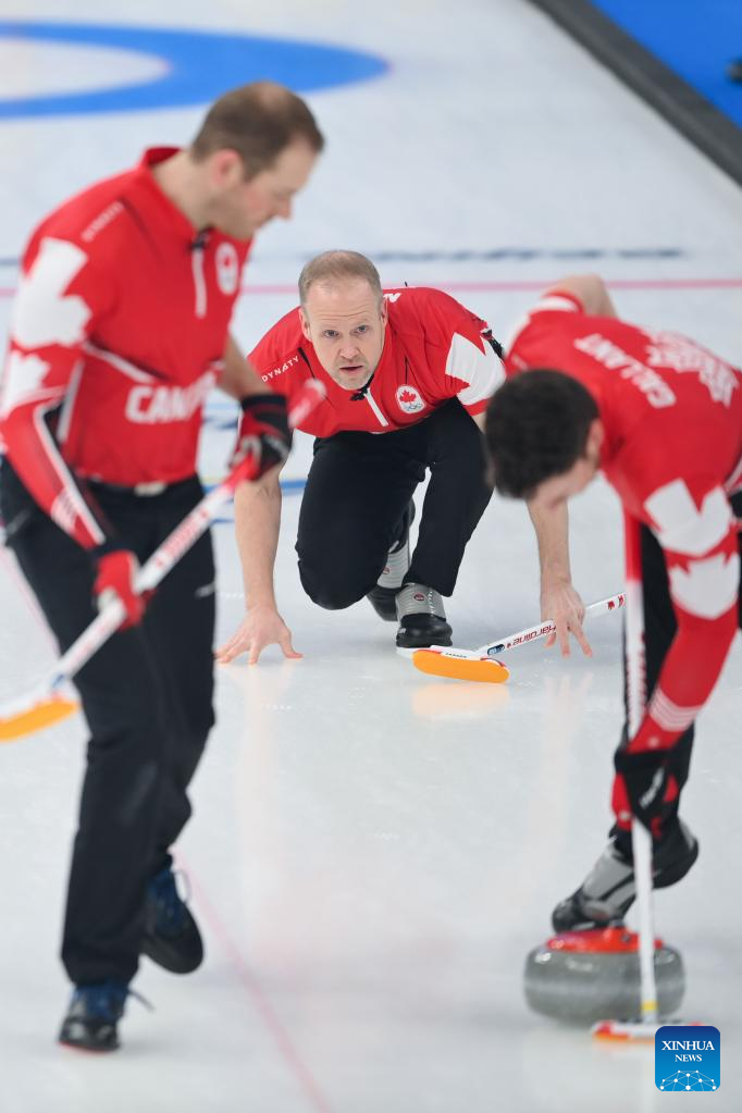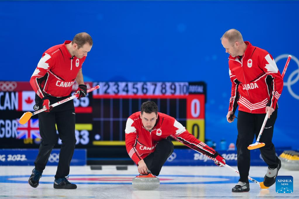 Mark Nichols (C) of Canada competes during the curling men's round robin session 12 of Beijing 2022 Winter Olympics between Great Britain and Canada at National Aquatics Centre in Beijing, capital of China, Feb. 17, 2022. (Xinhua/Xue Yuge)
