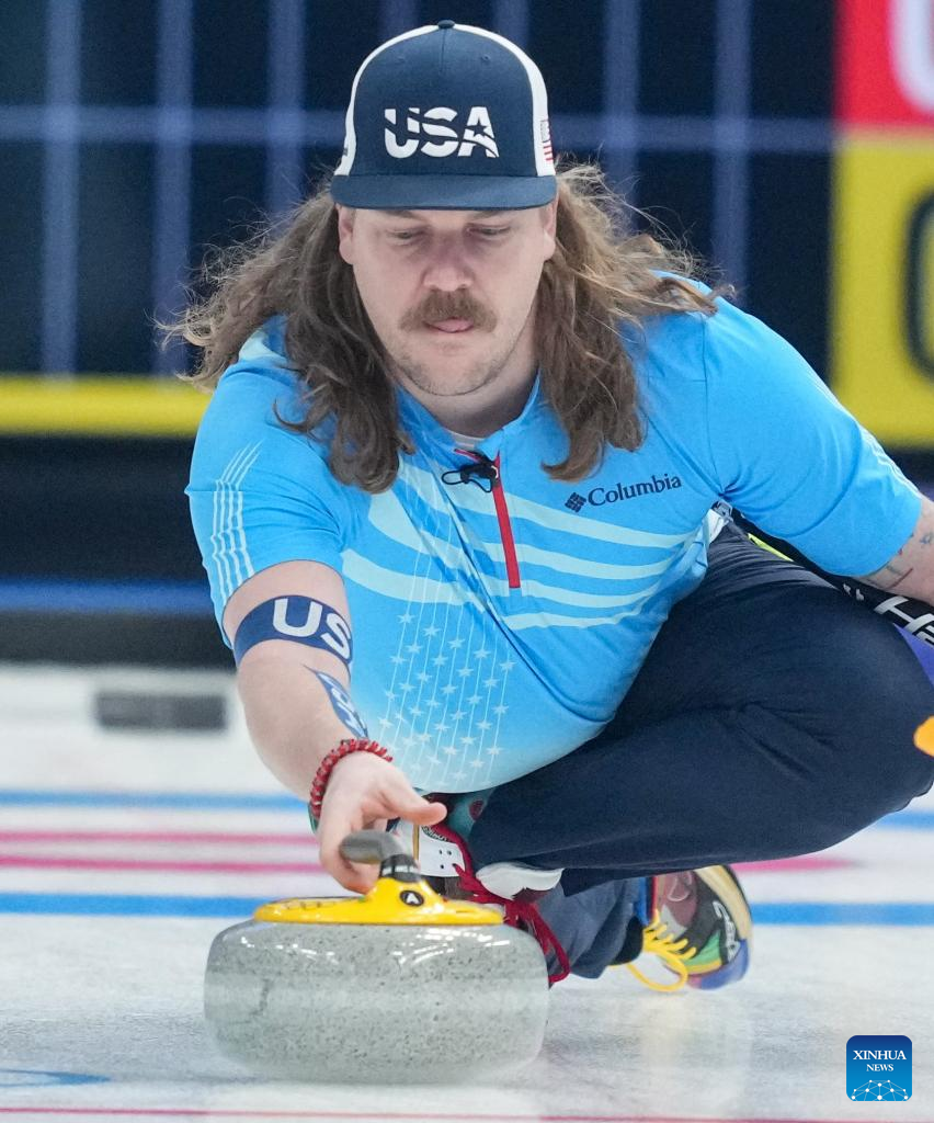 Matt Hamilton of the United States competes during the curling men's round robin session 12 of Beijing 2022 Winter Olympics between the United States and Denmark at National Aquatics Centre in Beijing, capital of China, Feb. 17, 2022. (Xinhua/Zhou Mi)