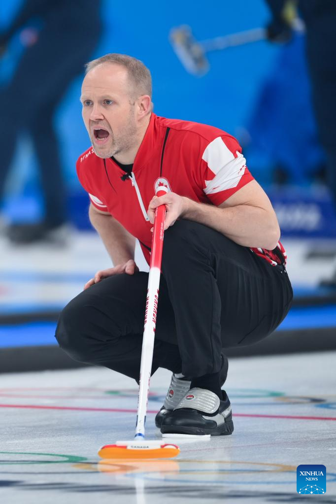 Mark Nichols of Canada competes during the curling men's round robin session 12 of Beijing 2022 Winter Olympics between Great Britain and Canada at National Aquatics Centre in Beijing, capital of China, Feb. 17, 2022. (Xinhua/Xue Yuge)