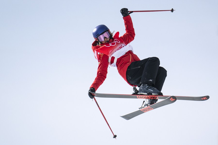 Chinese athlete Gu Ailing competes during the freestyle skiing women's freeski halfpipe qualification of Beijing 2022 Winter Olympics at Genting Snow Park in Zhangjiakou, north China's Hebei Province, Feb. 17, 2022. (Xinhua/Xiao Yijiu)
