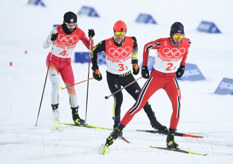 Espen Bjornstad (R) of Norway, Manuel Faisst (C) of Germany and Watabe Yoshito of Japan compete during cross-country of Nordic combined large hill/4x5km team event at the National Cross-Country Skiing Center in Zhangjiakou, north China's Hebei Province, Feb. 17, 2022. (Xinhua/Dai Tianfang)