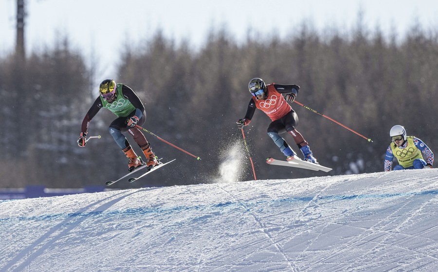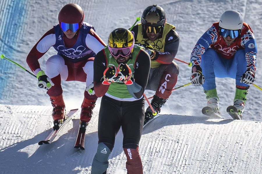 Ryan Regez (2nd L) of Switzerland competes in the freestyle skiing men's ski cross of Beijing 2022 Winter Olympics at Genting Snow Park in Zhangjiakou, north China's Hebei Province, Feb. 18, 2022. (Xinhua/Xiao Yijiu)