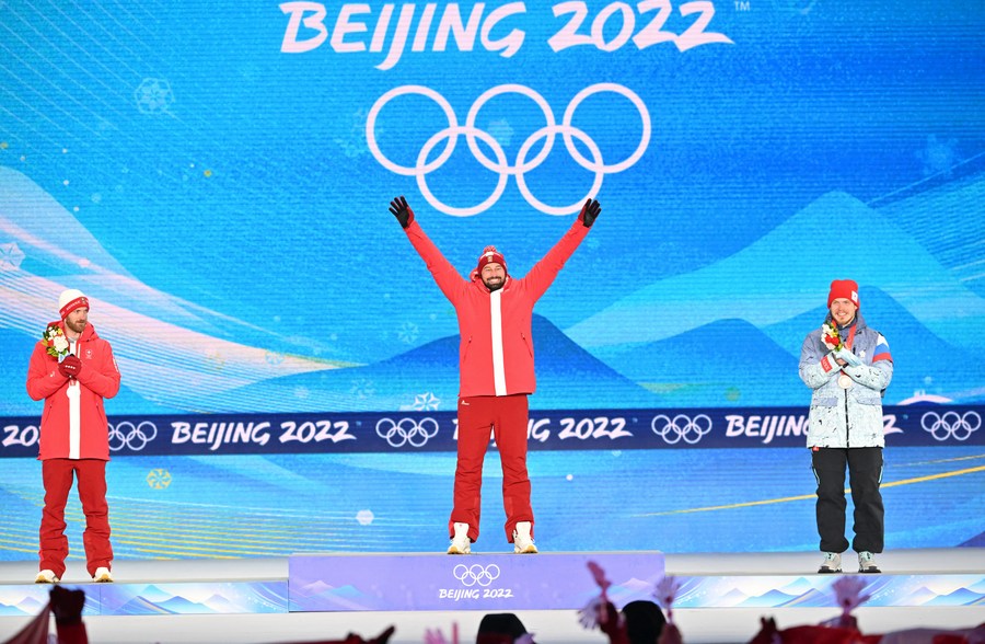 Gold medalist Ryan Regez (C) of Switzerland, silver medalist Alex Fiva (L) of Switzerland and bronze medalist Sergey Ridzik of ROC attend the award ceremony of freestyle skiing men's ski cross at Beijing 2022 in Zhangjiakou, north China's Hebei Province, Feb. 18, 2022. (Xinhua/Zhu Zheng)