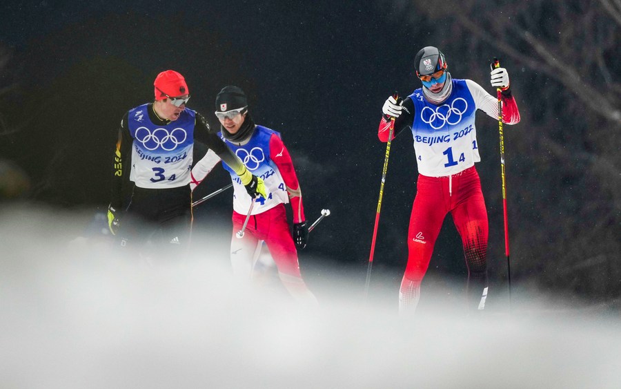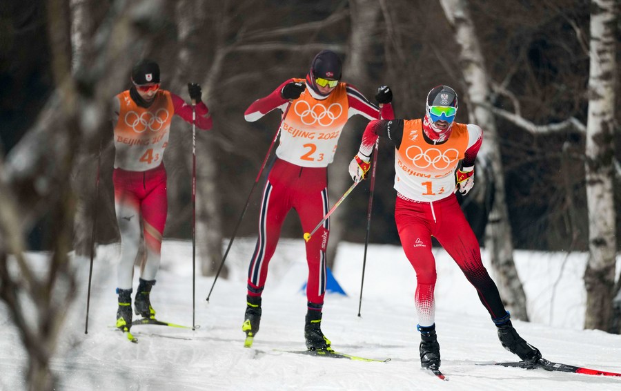 Watabe Akito of Japan, Jens Luraas Oftebro of Norway and Lukas Greiderer of Austria (from L to R) compete during cross-country competition round of nordic combined team gundersen large hill/4x5km at the National Ski Jumping Centre in Zhangjiakou, north China's Hebei Province, Feb. 17, 2022. (Xinhua/Hu Huhu)