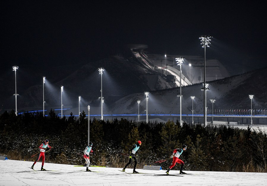 Espen Andersen of Norway, Nagai Hideaki of Japan, Julian Schmid of Germany and Johannes Lamparter of Austria (from L to R) compete during cross-country competition round of nordic combined team gundersen large hill/4x5km at the National Ski Jumping Centre in Zhangjiakou, north China's Hebei Province, Feb. 17, 2022. (Xinhua/Feng Kaihua)