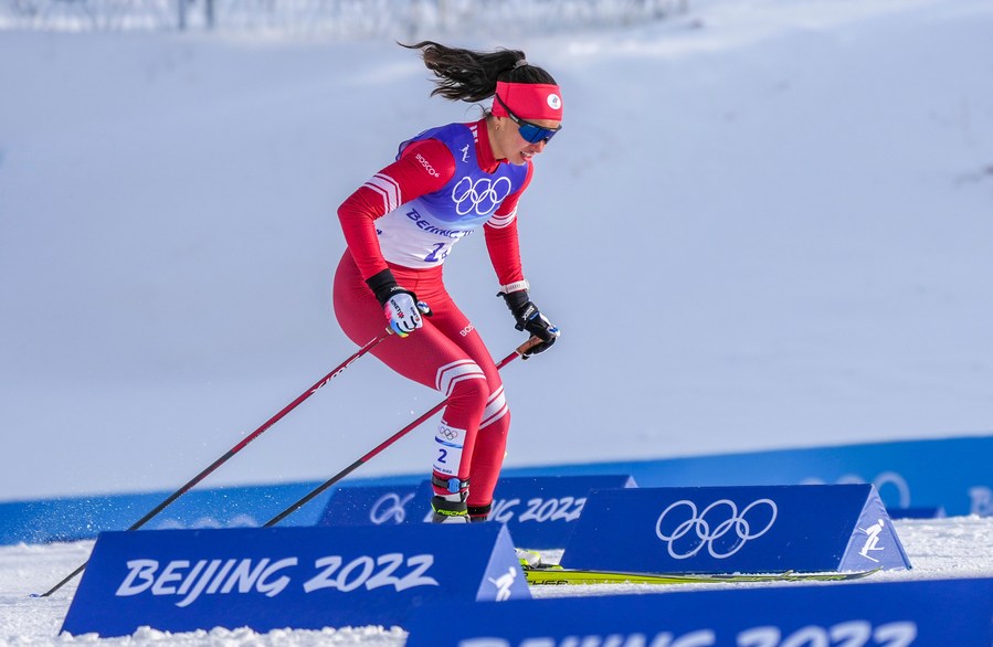 Veronika Stepanova of ROC competes during the cross-country skiing women's 4x5 km relay of Beijing 2022 Winter Olympics at National Cross-Country Skiing Center in Zhangjiakou, north China's Hebei Province on Feb. 12, 2022. (Xinhua/Liu Chan)