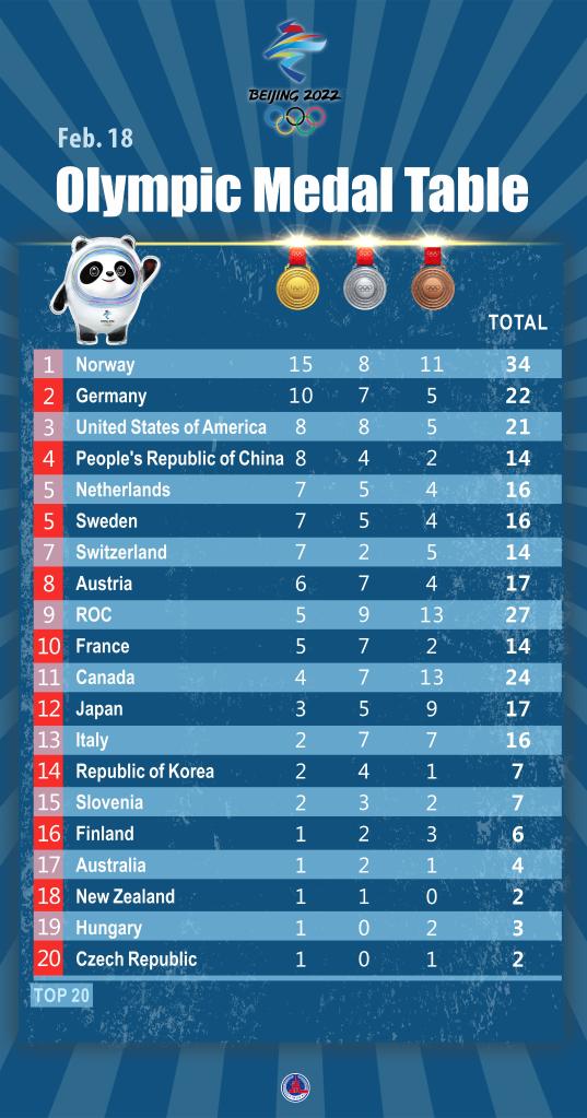 BEIJING, Feb. 18 (Xinhua) -- Following is the medal table at the 2022 Beijing Winter Olympics on Feb. 18.