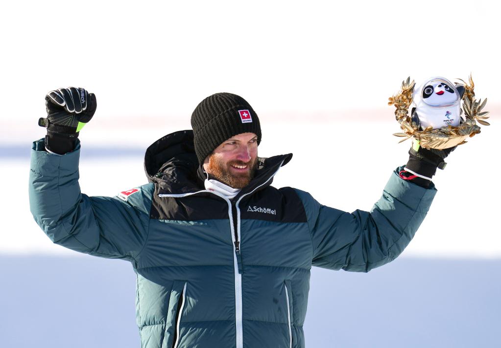 Alex Fiva of Switzerland celebrates during the flower ceremony after the freestyle skiing men's ski cross big final of Beijing 2022 Winter Olympics at Genting Snow Park in Zhangjiakou, north China's Hebei Province, Feb. 18, 2022. (Xinhua/Hu Huhu)