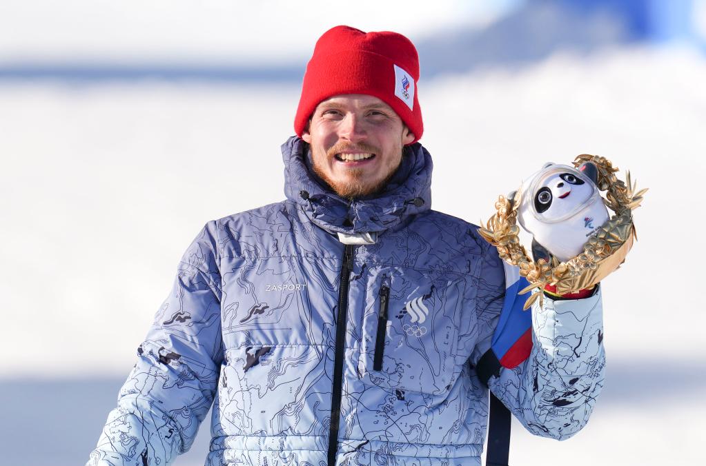 Sergey Ridzik of ROC poses for photos during the flower ceremony after the freestyle skiing men's ski cross big final of Beijing 2022 Winter Olympics at Genting Snow Park in Zhangjiakou, north China's Hebei Province, Feb. 18, 2022. (Xinhua/Hu Huhu)