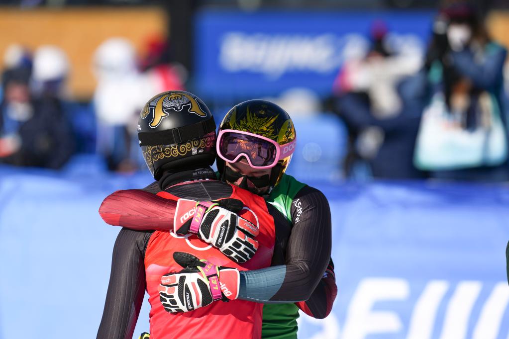 Ryan Regez (R) and Alex Fiva of Switzerland celebrate after the freestyle skiing men's ski cross big final of Beijing 2022 Winter Olympics at Genting Snow Park in Zhangjiakou, north China's Hebei Province, Feb. 18, 2022. (Xinhua/Hu Huhu)