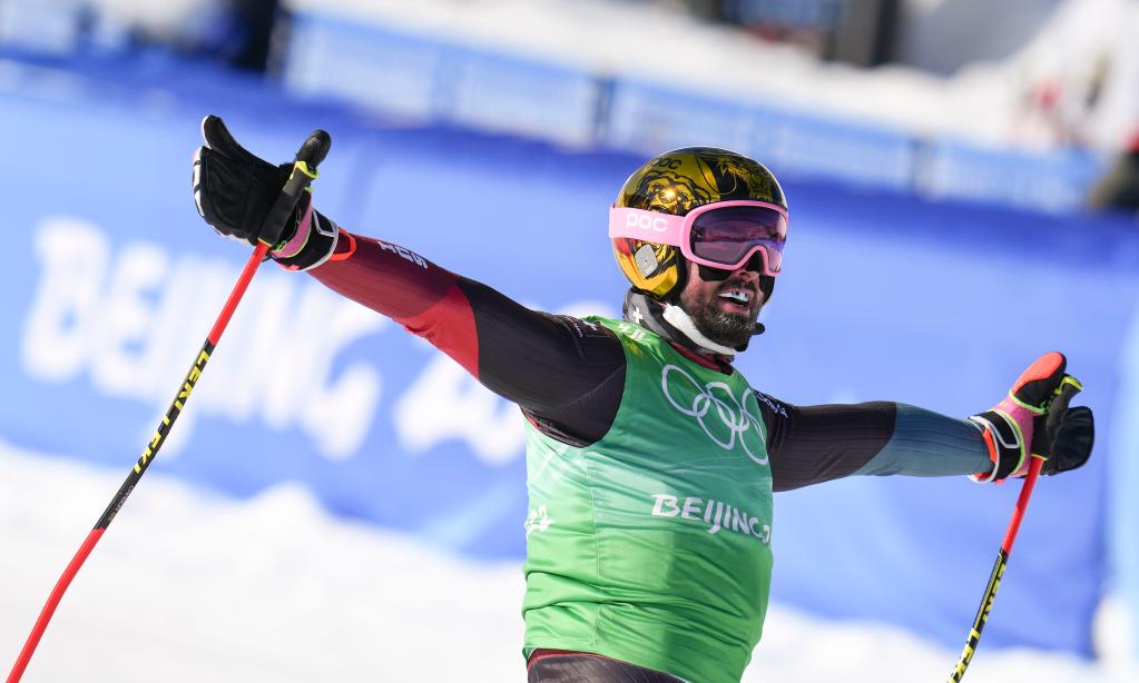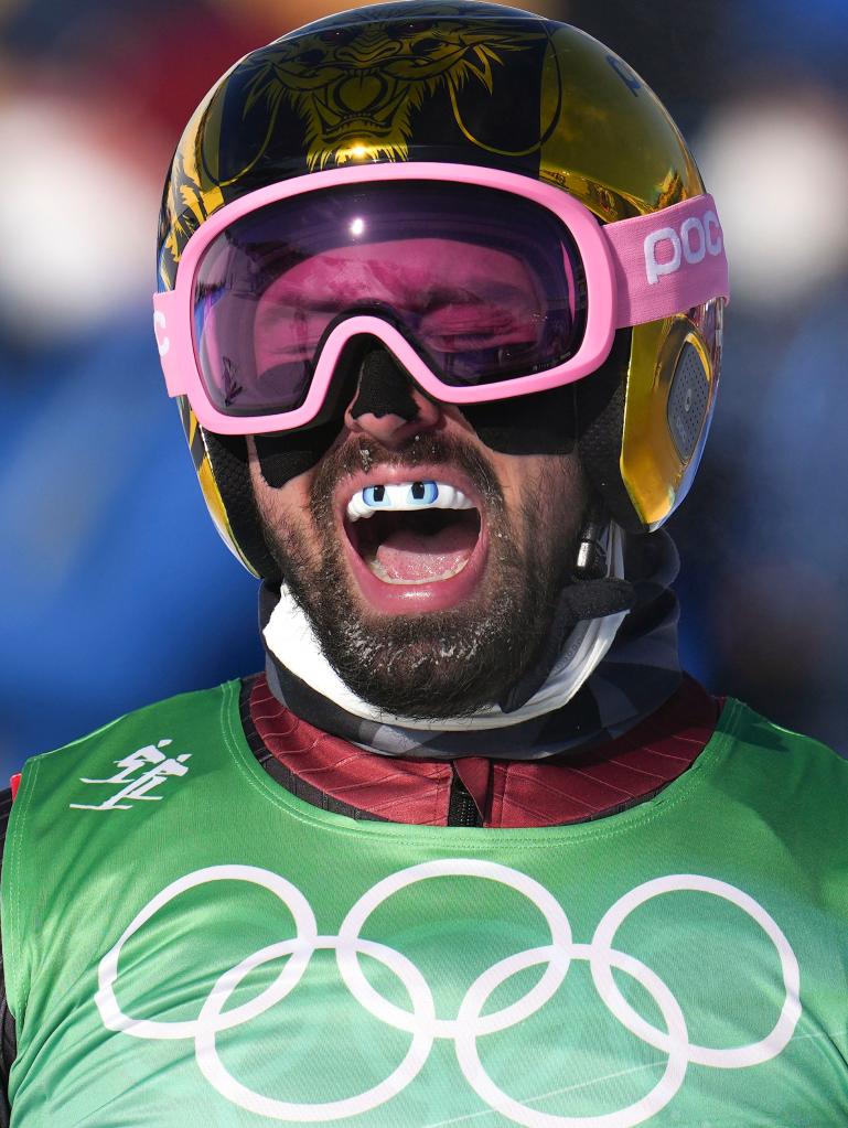 Ryan Regez of Switzerland celebrates after the freestyle skiing men's ski cross big final of Beijing 2022 Winter Olympics at Genting Snow Park in Zhangjiakou, north China's Hebei Province, Feb. 18, 2022. (Xinhua/Hu Huhu)