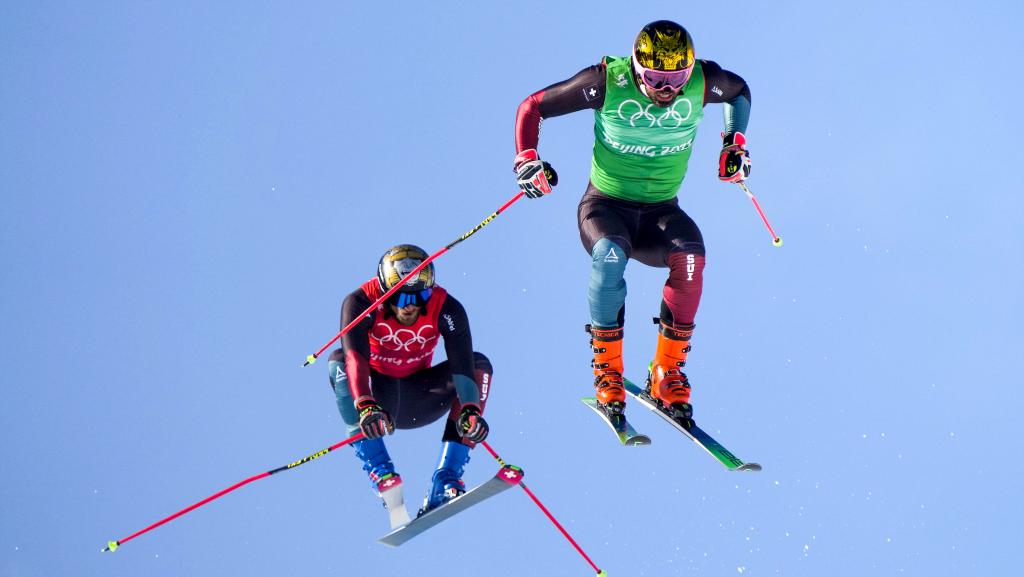 Ryan Regez (R) and Alex Fiva of Switzerland compete during the freestyle skiing men's ski cross big final of Beijing 2022 Winter Olympics at Genting Snow Park in Zhangjiakou, north China's Hebei Province, Feb. 18, 2022. (Xinhua/Wang Haofei)