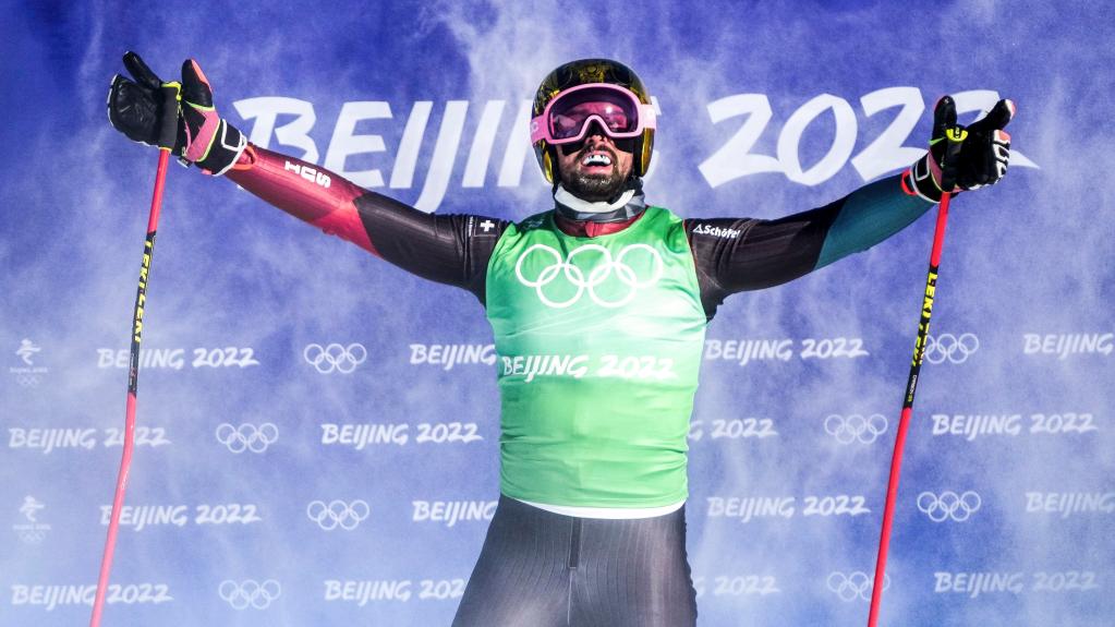 Ryan Regez of Switzerland celebrates after the freestyle skiing men's ski cross big final of Beijing 2022 Winter Olympics at Genting Snow Park in Zhangjiakou, north China's Hebei Province, Feb. 18, 2022. (Xinhua/Wang Haofei)