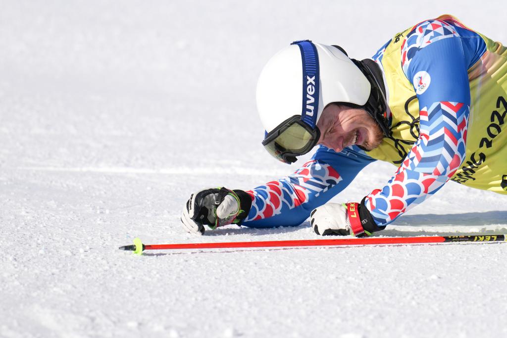 Sergey Ridzik of ROC reacts after the freestyle skiing men's ski cross big final of Beijing 2022 Winter Olympics at Genting Snow Park in Zhangjiakou, north China's Hebei Province, Feb. 18, 2022. (Xinhua/Hu Huhu)