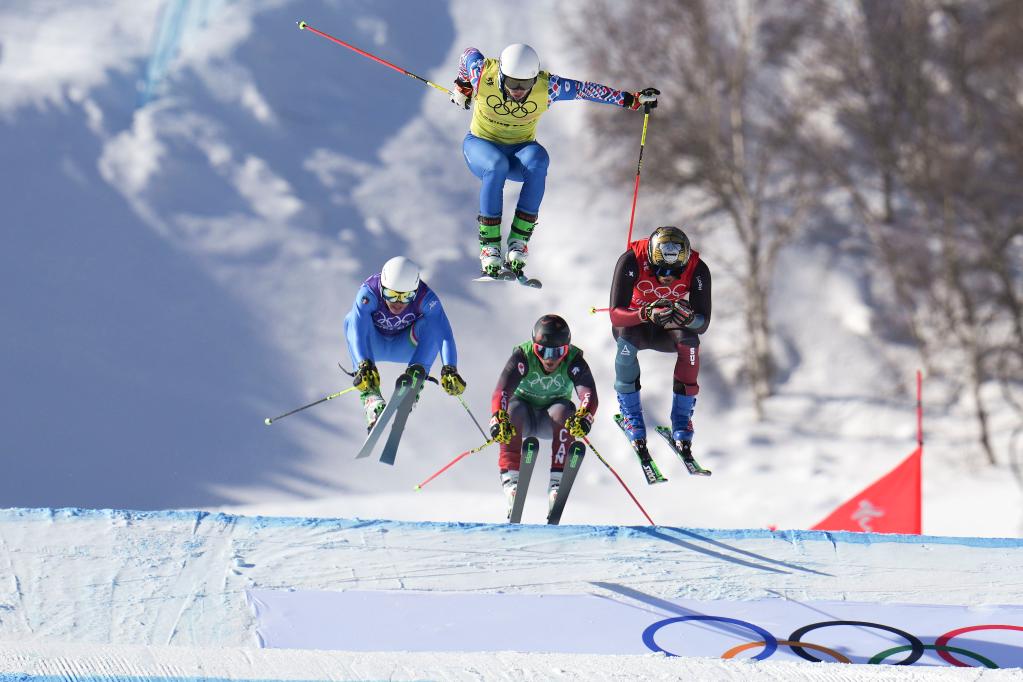 (L to R) Erik Mobaerg of Sweden, Sergey Ridzik of ROC, Alex Fiva of Switzerland and Ryan Regez of Switzerland compete during the freestyle skiing men's ski cross big final of Beijing 2022 Winter Olympics at Genting Snow Park in Zhangjiakou, north China's Hebei Province, Feb. 18, 2022. (Xinhua/Hu Huhu)