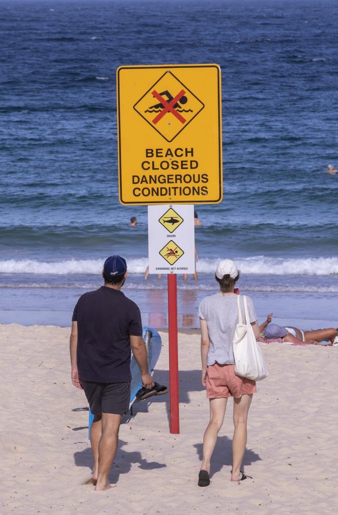 A warning sign is seen at Coogee beach in Sydney, Australia, Feb. 17, 2022. (Xinhua/Bai Xuefei)