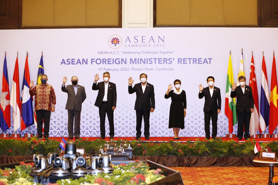 The ASEAN foreign ministers meeting or AMM Retreat is attended in person by foreign ministers of Indonesia, Malaysia, the Philippines, Singapore and Laos, and online by foreign ministers of Brunei, Thailand and Vietnam. (Photo by Sovannara/Xinhua)