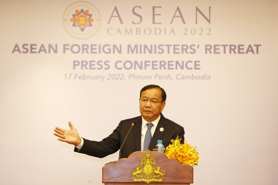 Cambodian Foreign Minister Prak Sokhonn attends a press conference in Phnom Penh, Cambodia, Feb. 17, 2022. (Photo by Sovannara/Xinhua)