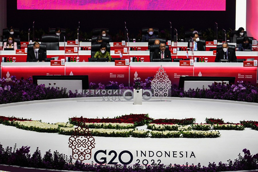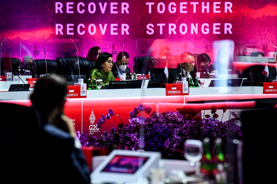 Indonesian Finance Minister Sri Mulyani Indrawati (2nd L, front) attends the opening ceremony of the G20 Finance Ministers and Central Bank Governors (FMCBG) meeting in Jakarta, Indonesia, Feb. 17, 2022. (Indonesian Finance Ministry/Handout via Xinhua)