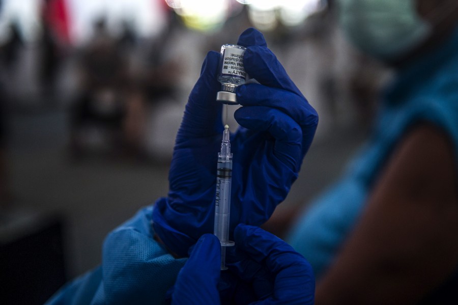 A health worker prepares a booster dose of COVID-19 vaccine in Medan, North Sumatra, Indonesia, Feb. 10, 2022. (Photo by Sutanta Aditya/Xinhua)