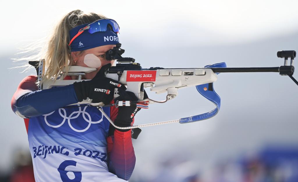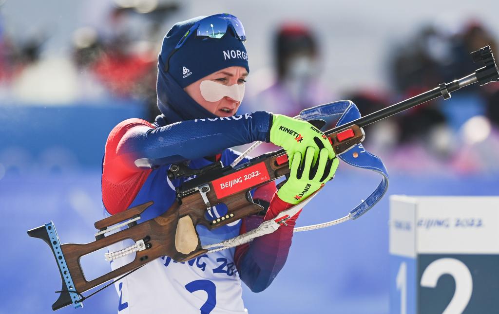 Tiril Eckhoff of Norway competes during the biathlon women's 12.5km mass start of Beijing 2022 Winter Olympics at National Biathlon Centre in Zhangjiakou, north China's Hebei Province, Feb. 18, 2022. (Xinhua/Deng Hua)