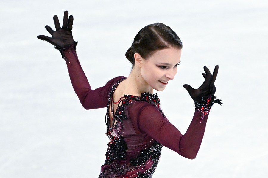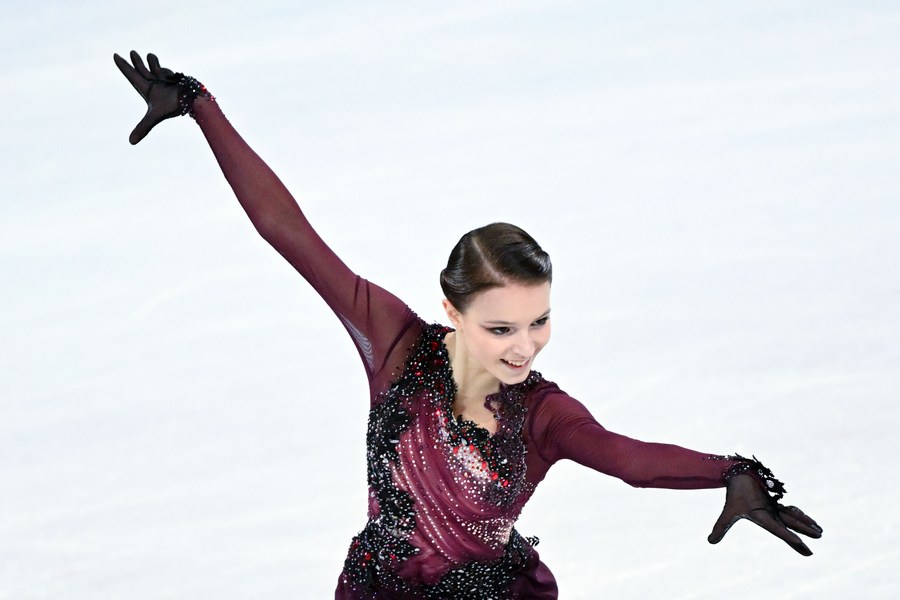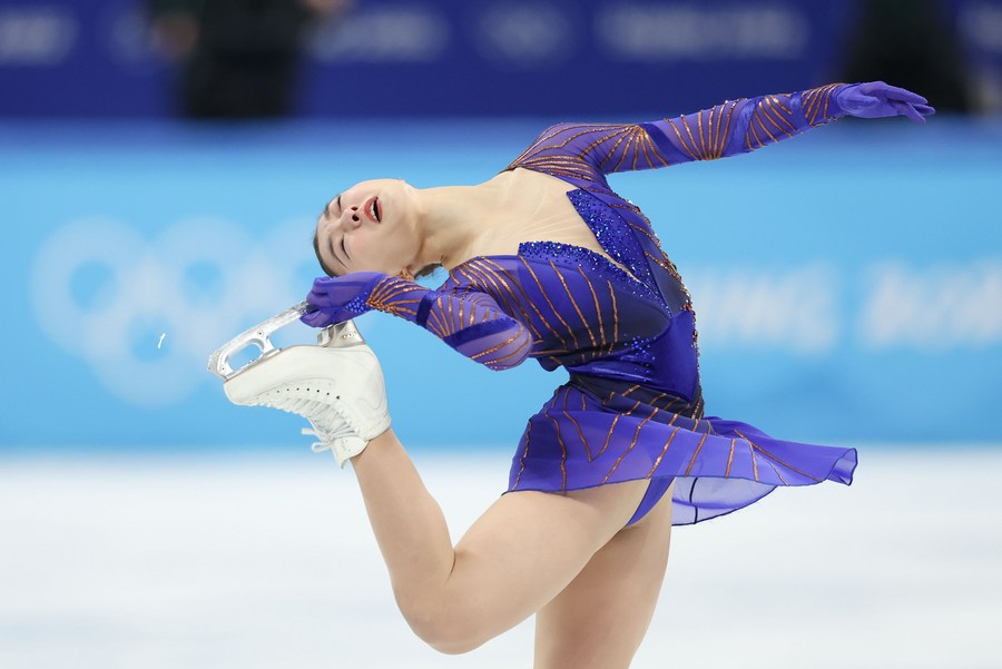 Anna Shcherbakova of ROC performs during the figure skating women single skating free skating of the Beijing 2022 Winter Olympics at Capital Indoor Stadium in Beijing, capital of China, Feb. 17, 2022. (Xinhua/Ma Ning)