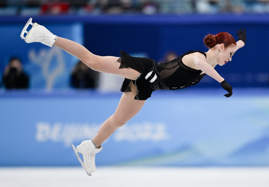 Anna Shcherbakova of ROC performs during the figure skating women single skating free skating of the Beijing 2022 Winter Olympics at Capital Indoor Stadium in Beijing, capital of China, Feb. 17, 2022. (Xinhua/Li Ziheng)