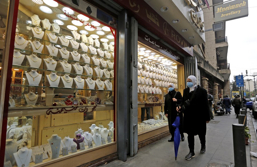 People pass by a jewellery store in Beirut, capital of Lebanon, on Feb. 15, 2022. (Xinhua/Bilal Jawich)