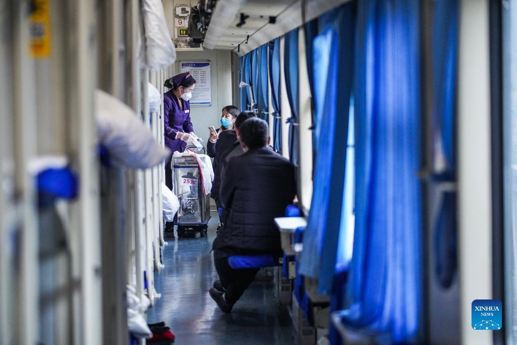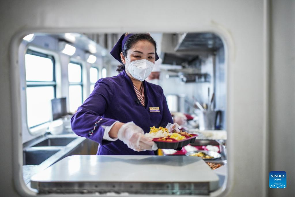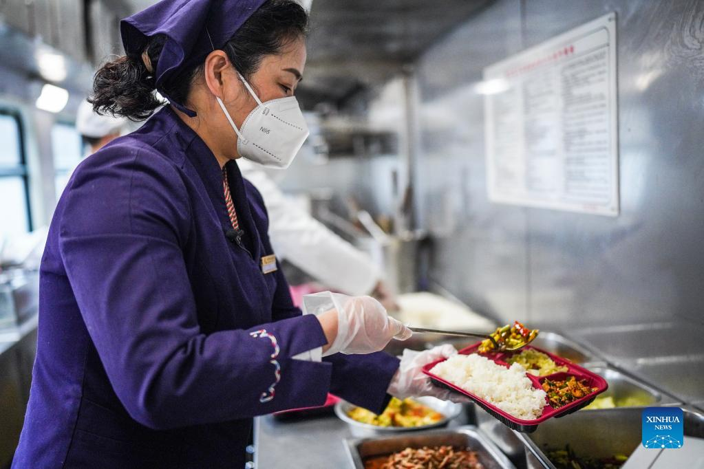 Tao Chunxiang prepares packed meals at the kitchen of the dining carriage aboard a train from Guiyang, southwest China's Guizhou Province to east China's Shanghai, Feb. 17, 2022. Tao Chunxiang is a dining car captain of Shanghai Team in Guiyang Passenger Transport Section. Tao started to work as a train attendant on dining carriage in 1992 and will retire in late February 2022. In 2006, she took the position of dining car captain. Over the years, she has led all the staff of the dining car class to strive to improve the quality of meals. She also takes advantage of the dining car's downtime offering seats for people who are in need. On her last shift to serve the Spring Festival travel rush before the retirement, she works hard to provide tasty food and good services to passengers as always. (Xinhua/Tao Liang)