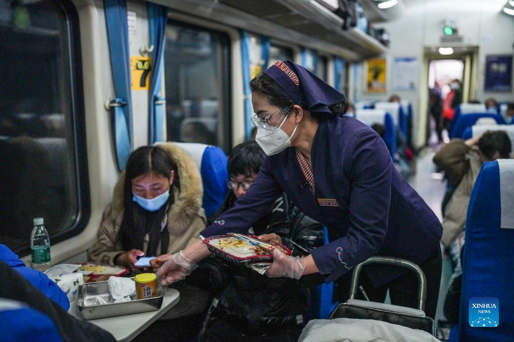 Tao Chunxiang gives a packed meal to a passenger aboard a train from Guiyang, southwest China's Guizhou Province to east China's Shanghai, Feb. 17, 2022. Tao Chunxiang is a dining car captain of Shanghai Team in Guiyang Passenger Transport Section. Tao started to work as a train attendant on dining carriage in 1992 and will retire in late February 2022. In 2006, she took the position of dining car captain. Over the years, she has led all the staff of the dining car class to strive to improve the quality of meals. She also takes advantage of the dining car's downtime offering seats for people who are in need. On her last shift to serve the Spring Festival travel rush before the retirement, she works hard to provide tasty food and good services to passengers as always. (Xinhua/Tao Liang)