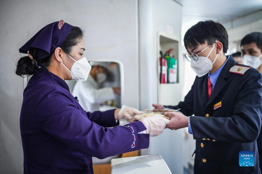Tao Chunxiang gives a packed meal to her colleague aboard a train from Guiyang, southwest China's Guizhou Province to east China's Shanghai, Feb. 17, 2022. Tao Chunxiang is a dining car captain of Shanghai Team in Guiyang Passenger Transport Section. Tao started to work as a train attendant on dining carriage in 1992 and will retire in late February 2022. In 2006, she took the position of dining car captain. Over the years, she has led all the staff of the dining car class to strive to improve the quality of meals. She also takes advantage of the dining car's downtime offering seats for people who are in need. On her last shift to serve the Spring Festival travel rush before the retirement, she works hard to provide tasty food and good services to passengers as always. (Xinhua/Tao Liang)