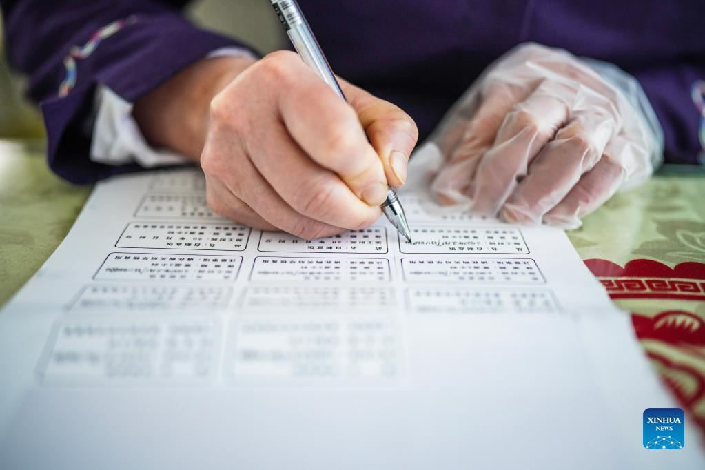 Tao Chunxiang writes date labels for packed meals aboard a train from Guiyang, southwest China's Guizhou Province to east China's Shanghai, Feb. 17, 2022. Tao Chunxiang is a dining car captain of Shanghai Team in Guiyang Passenger Transport Section. Tao started to work as a train attendant on dining carriage in 1992 and will retire in late February 2022. In 2006, she took the position of dining car captain. Over the years, she has led all the staff of the dining car class to strive to improve the quality of meals. She also takes advantage of the dining car's downtime offering seats for people who are in need. On her last shift to serve the Spring Festival travel rush before the retirement, she works hard to provide tasty food and good services to passengers as always. (Xinhua/Tao Liang)