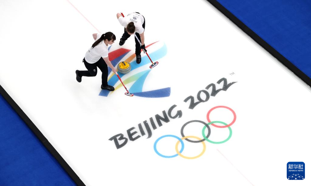 Hailey Duff (L) and Jennifer Dodds of Britain compete during curling woman's semifinal of the Beijing 2022 Winter Olympics between Sweden and Britain at the National Aquatics center in Beijing, China, Feb.18, 2022. (Xinhua/Huang Xiaobang)