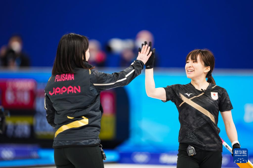 Fujisawa Satsuki (L) claps hands with Suzuki Yumi of Japan during curling woman's semifinal of the Beijing 2022 Winter Olympics between Japan and Switzerland at the National Aquatics center in Beijing, China, Feb.18, 2022. (Xinhua/Zhou Mi)