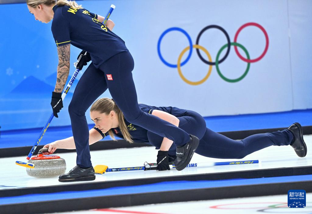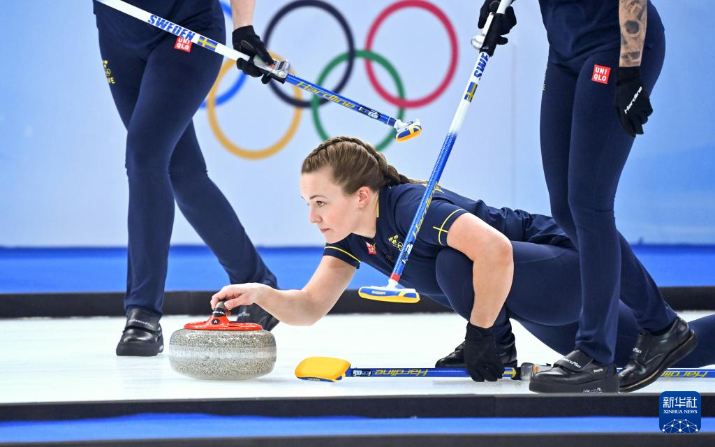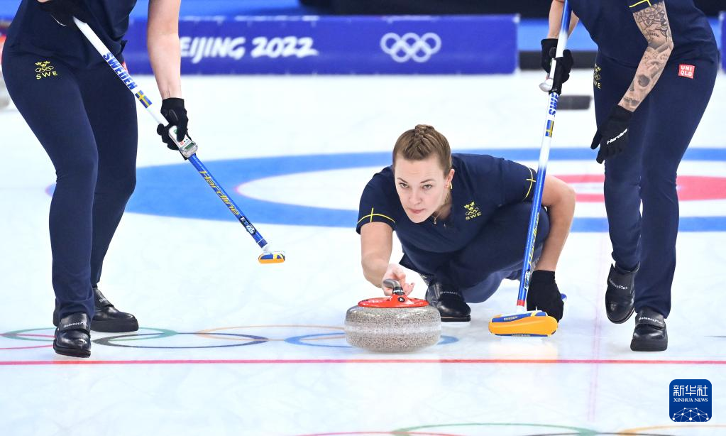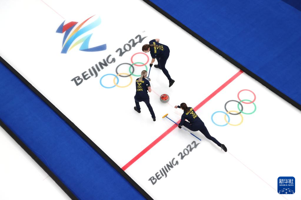 Athletes of Sweden compete during curling woman's semifinal of the Beijing 2022 Winter Olympics between Sweden and Britain at the National Aquatics center in Beijing, China, Feb.18, 2022. (Xinhua/Huang Xiaobang)