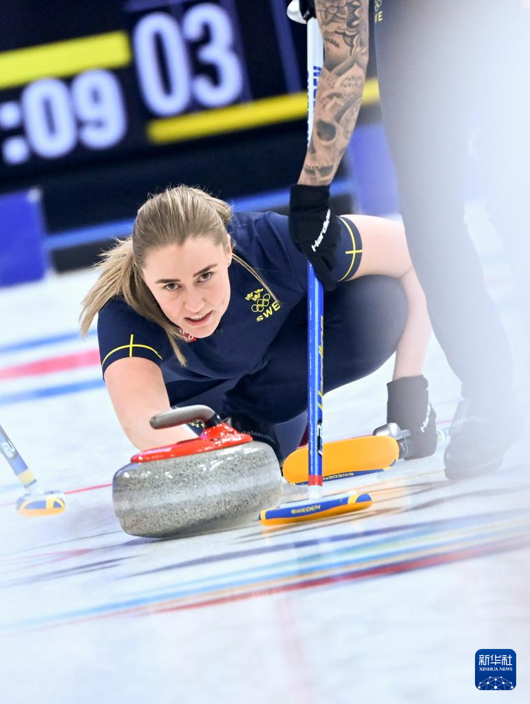 Agnes Knochenhauer of Sweden curls the stone during curling woman's semifinal of the Beijing 2022 Winter Olympics between Sweden and Britain at the National Aquatics center in Beijing, China, Feb.18, 2022. (Xinhua/Huang Xiaobang)
