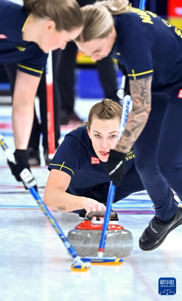 Agnes Knochenhauer (C) of Sweden curls the stone during curling woman's semifinal of the Beijing 2022 Winter Olympics between Sweden and Britain at the National Aquatics center in Beijing, China, Feb.18, 2022. (Xinhua/Huang Xiaobang)