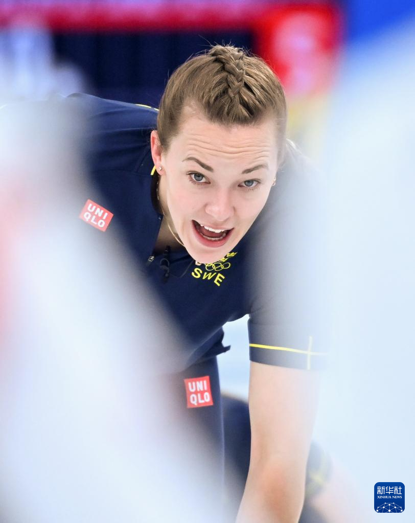 Sara McManus of Sweden competes during curling woman's semifinal of the Beijing 2022 Winter Olympics between Sweden and Britain at the National Aquatics center in Beijing, China, Feb.18, 2022. (Xinhua/Huang Xiaobang)