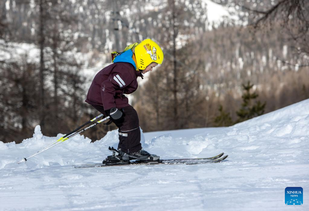A child skis at an alpine skiing resort in Cortina d'Ampezzo, Italy, Feb. 18, 2022. Italian cities Milan and Cortina d'Ampezzo were appointed hosts of the 2026 Winter Olympic Games at the 134th session of the International Olympic Committee (IOC) on June 24, 2019. The 2026 Winter Olympic Games will be the third time Italy hosts the Winter Olympics, following Turin in 2006 and Cortina d'Ampezzo in 1956. (Xinhua/Liu Yongqiu)