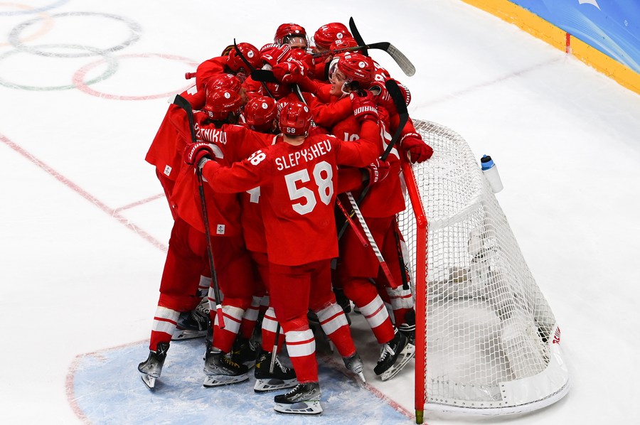 Players of the ROC celebrate after victory against Sweden in the semifinals of men's ice hockey event of Beijing 2022 at National Indoor Stadium in Beijing, capital of China, Feb. 18, 2022. (Xinhua/Liu Xiao)