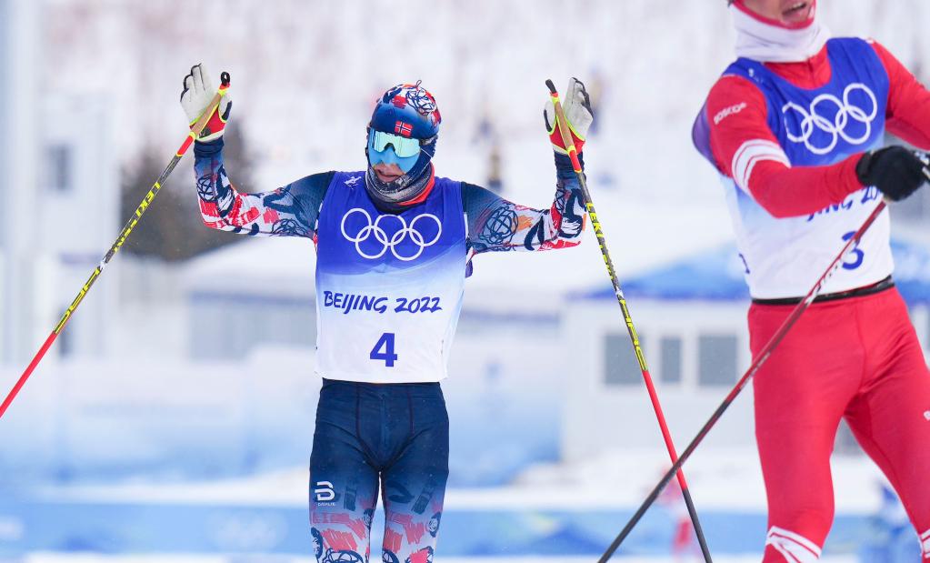 Simen Hegstad Krueger (L) of Norway reacts during the cross-country skiing men's 50km mass start free of Beijing 2022 Winter Olympics at National Cross-Country Skiing Centre in Zhangjiakou, north China's Hebei Province, Feb. 19, 2022. The men's 50km cross-country mass start race on Saturday has been delayed by an hour to 1500 local time (0700 GMT) and shortened to 30km due to high winds at the National Cross-Country Centre. (Xinhua/Liu Chan)