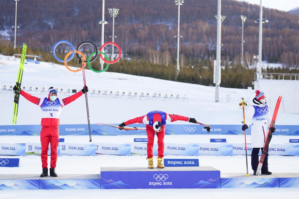 Bolshunov won the event in one hour, 11 minutes and 32.7 seconds, grabbing his third gold medal at Beijing 2022 cross-country skiing, after his victory in men's 15km + 15km skiathlon and men's 4 x 10km relay. He also took a silver in men's 15km classic and a bronze in men's team sprint classic at the National Cross-Country Skiing Center.