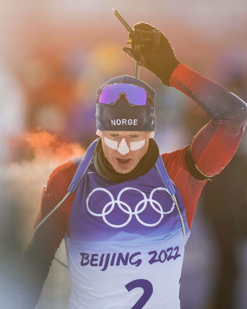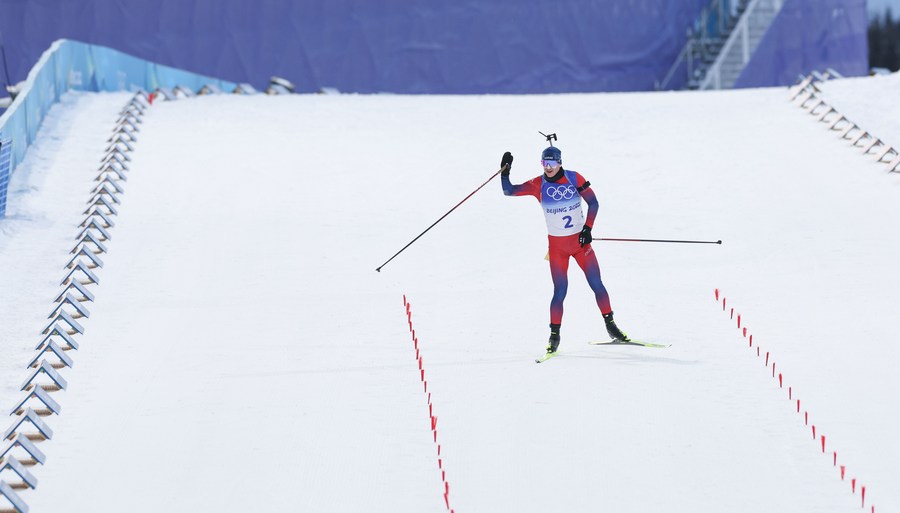 Johannes Thingnes Boe of Norway reacts during biathlon men's 15km mass start of Beijing 2022 Winter Olympics at National Biathlon Centre in Zhangjiakou, north China's Hebei Province, Feb. 18, 2022. (Xinhua/Ding Ting)