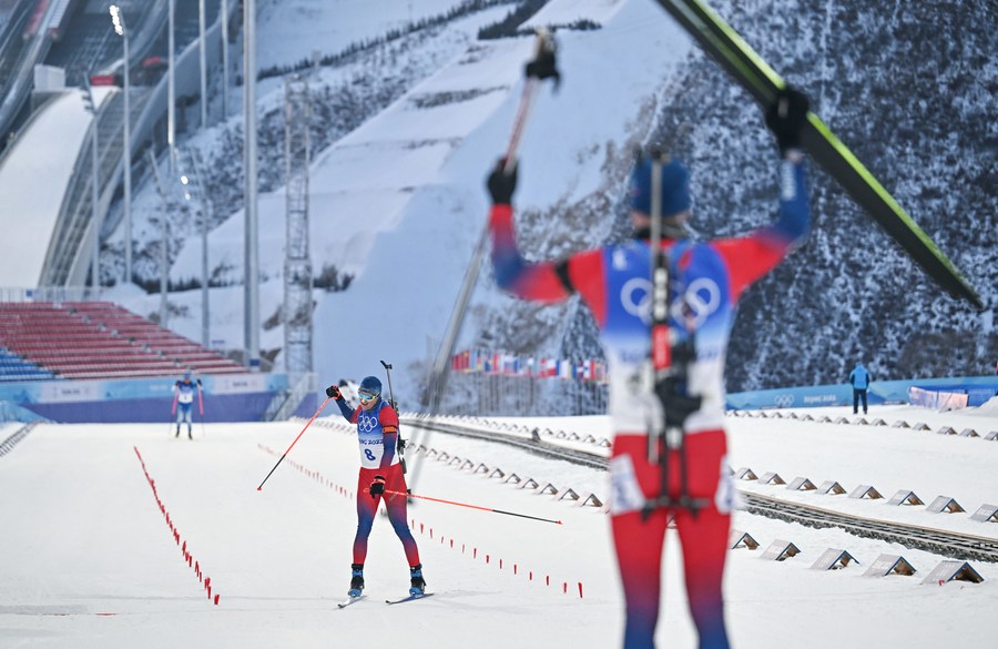 Vetle Sjaastad Christiansen (C) of Norway competes during biathlon men's 15km mass start of Beijing 2022 Winter Olympics at National Biathlon Centre in Zhangjiakou, north China's Hebei Province, Feb. 18, 2022. (Xinhua/Mu Yu)